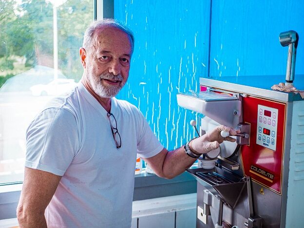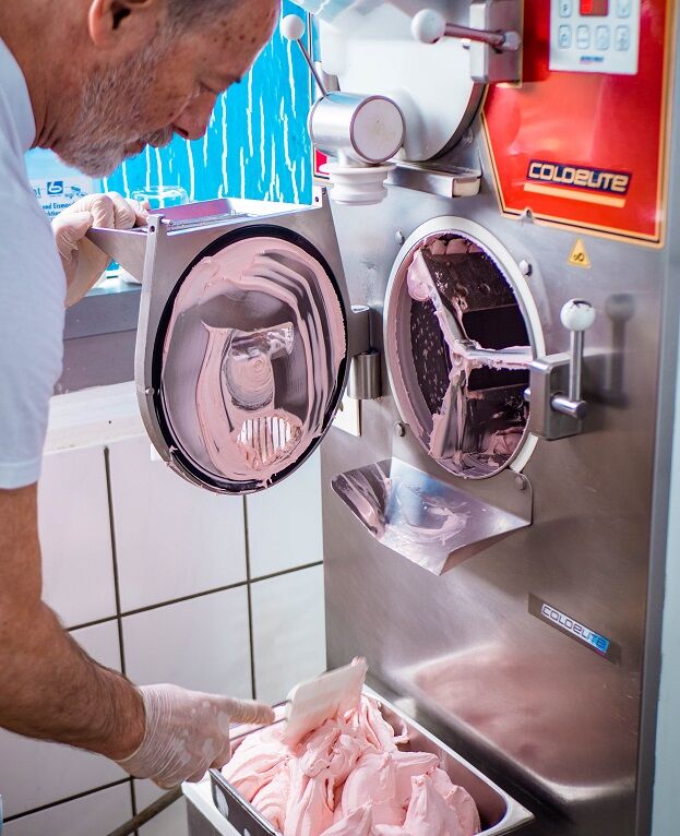 Unser Eis stellt Cristos Dossis in unserer Eisküche selbst her. Wir verwenden ausschließlich natürliche Zutaten. Das bedeutet, dass wir weder Aromen, Zusatzstoffe oder Farbstoffe hinzugeben. Unser Milchwassereis besteht lediglich aus Milch, Sahne und Zucker als natürlichen Konservierungsstoff und Frostschutz, damit keine Eiskristalle entstehen. Unsere Rohstoffe, wie beispielsweise unsere Pistazien, sind original aus Sizilien und nicht aus anderen Ländern. Das ist zwar etwas teurer, aber dafür sind diese Pistazien nicht gespritzt und dadurch hochwertiger. Das ist uns wichtig. Unser Fruchteis enthält keine Milch oder Sahne, ist deswegen bestens für Veganer:innen und Menschen mit Unverträglichkeiten geeignet. Es besteht aus frischen oder tiefgefrorenen Früchten, je nach Saison, Wasser und Zucker. Ab und an benutzen wir hundertprozentiges Fruchtmark, wenn beispielsweise gerade keine Erdbeersaison ist. Laut gesetzlichen Bestimmungen muss der Fruchtanteil bei mindestens 20 Prozent liegen. Bei uns beträgt dieser Anteil zwischen 25 und 27 Prozent. Wenn das Eis mithilfe unserer Eismaschine gemacht wurde, kommt es anschließend für etwa ein bis zwei Stunden in die Kühlung bei minus 20 Grad, damit es anschließend bei ungefähr 13 bis 15 Grad in unsere Eistheke zum Verkauf kommt.