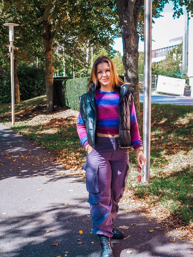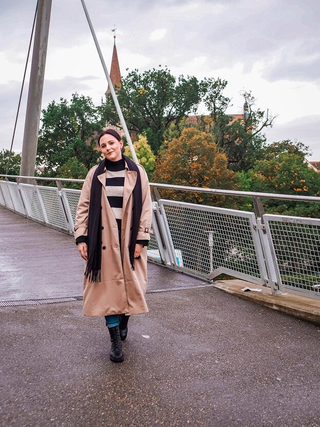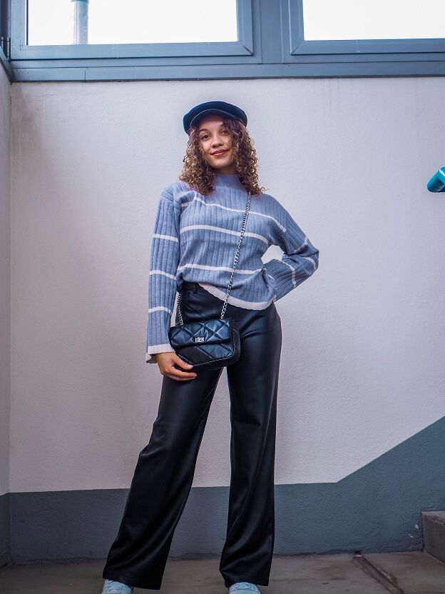 Dazu ein gestreifter Strickpullover und kuscheliger Schal und schon bist Du gewappnet für die kälteren Tage.