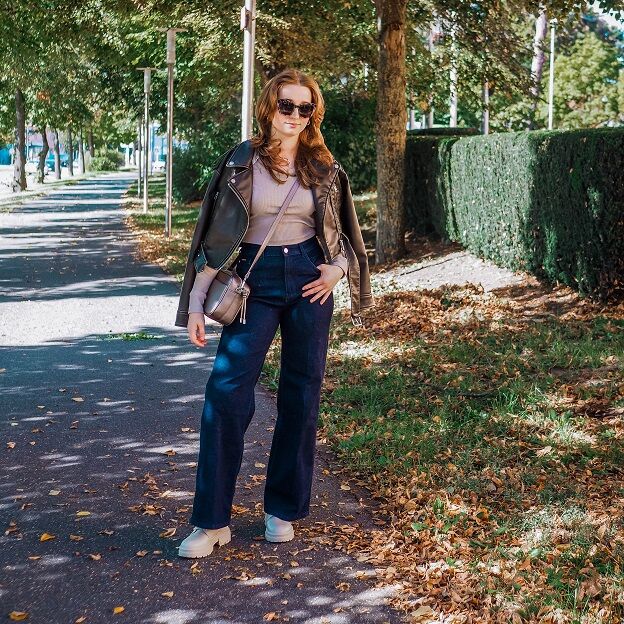 Mit diesen Farben kannst du dir kinderleicht ein Outfit zusammenstellen, da sich alles miteinander kombinieren lässt. Kati von C&A trägt ihre trendige braune Leder-Jacke mit einem schlichten beigen Oberteil und den passenden Boots dazu.