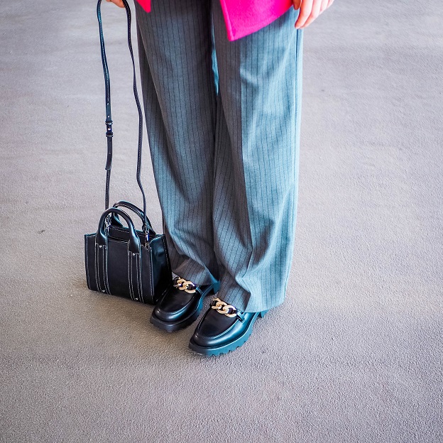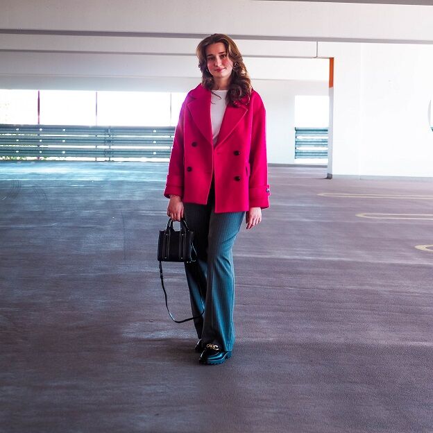 Bei C&A findet ihr dieses hübsche Modell in der Trendfarbe pink! Durch eine elegante graue Stoffhose mit dünnen Streifen und schwarzen Leder-Loafers wirkt der Look total edel. Die schwarze Tasche passt optimal zum Rest des Outfits rundet euren Auftritt ab.
