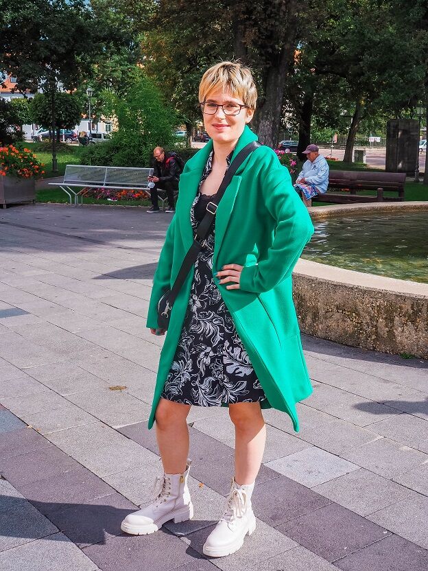 Model Michelle von Takko zeigt uns wie man einen Mantel in knalligem Bottega Grün gut mit Basicfarben kombinieren kann. Sie trägt ein schwarz-weiß gemustertes Kleid und weiße Stiefel, die den knalligen Mantel optimal zur Geltung bringen.