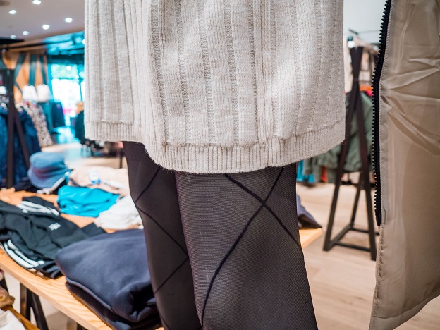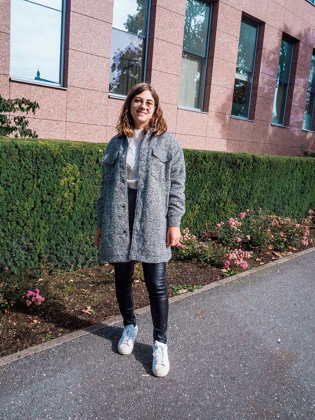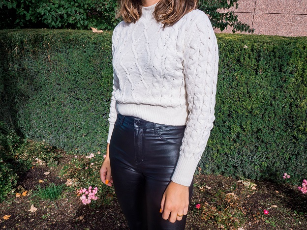 Luisa präsentiert uns ein stylisches Outfit mit Skinny-Jeans im Lederlook von Tally Weijl. Dazu trägt sie einen beigen Strickpullover und eine schwarz-weiße Tweed- Jacke. Der Look ist perfekt für die etwas wärmeren Herbsttage geeignet.