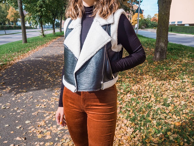 Cord geht einfach immer und gehört auch dieses Jahr wieder zu den angesagten Stoffen. Luisa kombiniert die rotbraune Cordhose mit Schlag mit einem klassischem schwarzen Rollkragenshirt und dazu eine coole Biker-Weste mit Teddyfutter. Das lässige Outfit könnt ihr bei Tally Weijl nachshoppen.